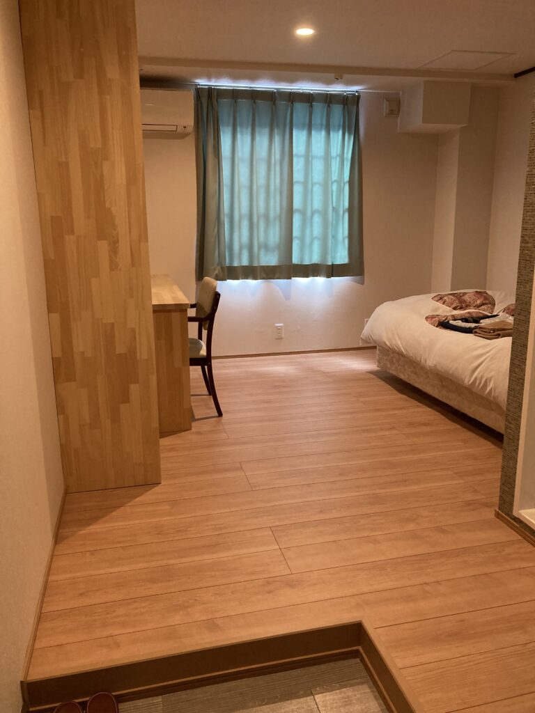 下の画像の部屋は元々和室でしたがプローリングの床にして裸足おくつろぎいただけようにしました。